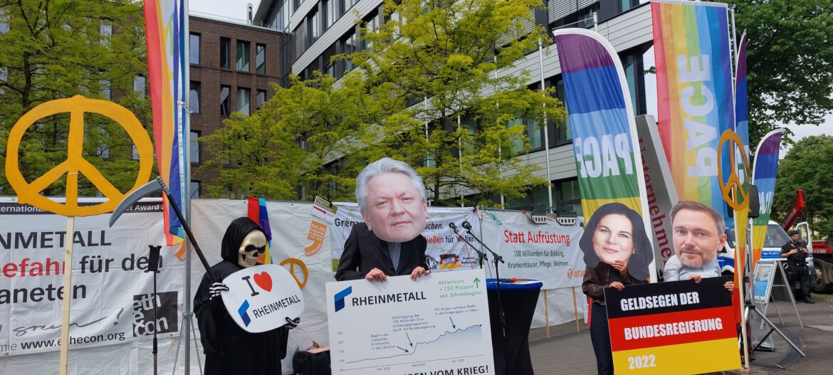 Der russische Angriffskrieg gegen die Ukraine kennt fast nur Verlierer*innen, aber es gibt auch Kriegsprofiteure: Die Waffen- und Rüstungskonzerne. Einer dieser Profiteure ist die Düsseldorfer Firma Rheinmetall – der größte Munitions- und Kriegswaffenhersteller Deutschlands. Der Krieg in der Ukraine und die Aufrüstungspolitik der Ampel-Bundesregierung kurbeln so sehr das Wachstum des Rüstungskonzerns an, dass Rheinmetall allein in diesem Jahr 1000 neue Stellen in Deutschland schaffen wird. So kündigte Rheinmetall an, mindestens 42 Milliarden Euro des 100-Milliarden-Pakets für die Bundeswehr zu beanspruchen. Doch womit genau verdient Rheinmetall sein Geld?